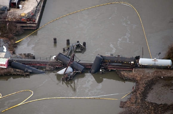 Nákladný vlak s chemikáliami v piatok vykoľajil pri americkom meste Paulsboro v štáte New Jersey. Ako informovala agentúra AFP, tri vagóny skončili v rieke. Vlak viezol vinylchlorid, ktorý sa používa napríklad pri výrobe PVC. Úrady evakuovali miesto nehody, ale vyhlásili, že žiadne nebezpečenstvo nehrozí. Preventívne však išlo na lekársku prehliadku najmenej 22 osôb. Foto: SITA/AP Photo/Cliff Owen