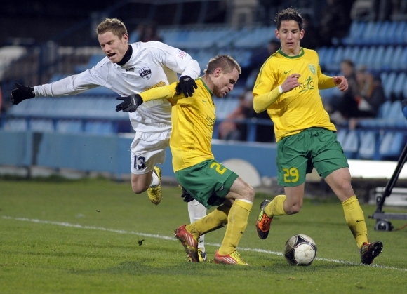 Zľava: Vratislav Gajdoš z FC Nitra, Stanislav Angelovič a Jakub Paur z MŠK Žilina počas 19. kola futbalovej Corgoň ligy medzi FC Nitra - MŠK Žilina. Nitra, 30. november 2012. Futbalisti Nitry porazili na domácom trávniku hostí zo Žiliny 2:0. Foto: SITA/Martin Havran