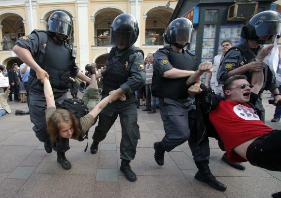Ruskí policajti riešia nepohodlných aktivistov, protestujúcich v Petrohrade proti vláde. Foto: SITA/AP