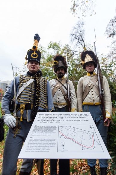 Členovia klubu vojenskej histórie - C. k. husársky pluk č. 12 Palatín uhorský - počas odhalenia náučnej tabule na protinapoleónskom obrannom vale Bratislavy z roku 1809. Foto: Foto: SITA/Jozef Jakubčo