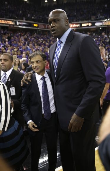 Väčšinový vlastník basketbalového tímu Sacramento Kings Vivek Ranadive (vľavo) s bývalou hviezdou NBA Shaquillom O'Nealom, ktorý má v tíme tiež menší podiel. Kings vyhrali vo svojom tohtoročnom otváracom zápase NBA nad Denver Nuggets 90-88. Foto: SITA/AP