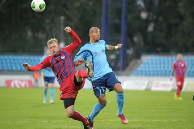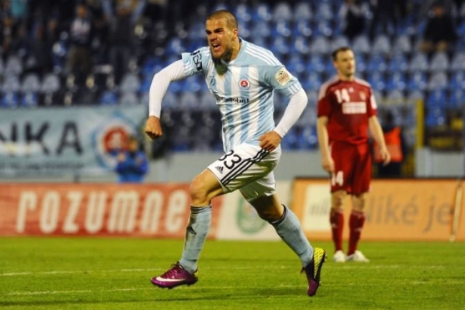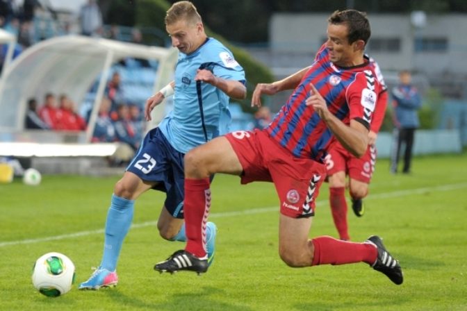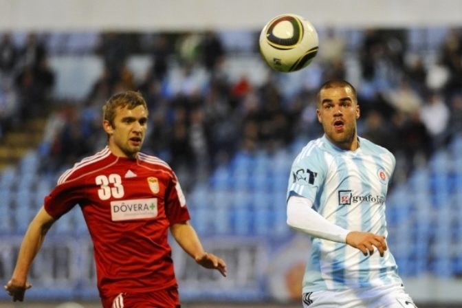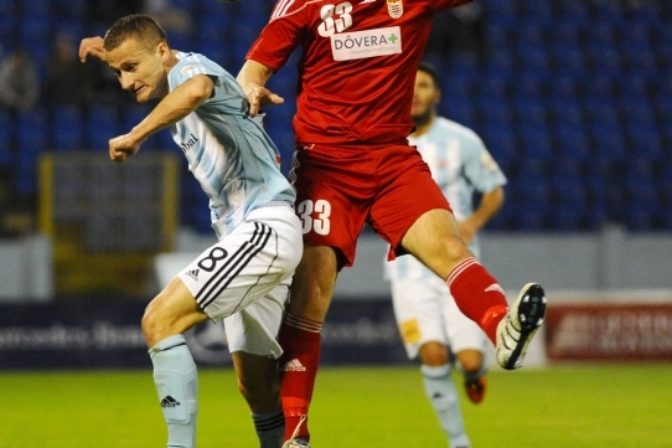 Hráč Košíc Šačir Redžepi (dole) a hráč Slovana Erik Grendel (hore) počas zápasu 32. kola futbalovej Corgoň ligy medzi ŠK Slovan Bratislava a MFK Košice. Bratislava, 16. máj 2012. Foto: SITA/Jozef Jakubčo