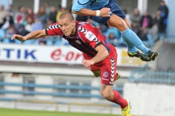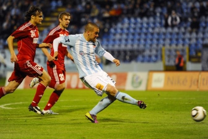 Zľava: Martin Mikovič - hráč Trnavy strieľa gól počas zápasu 32. kola futbalovej corgoň ligy medzi FC Spartak Trnava a MFK Ružomberok. Trnava, 16. máj 2012. Foto: SITA/Ivan Kopčáni