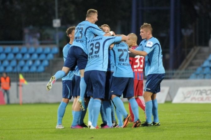 Sprava: Martin Mikovič - hráč Trnavy sa teší zo spoluhráčmi z gólu počas zápasu 32. kola futbalovej corgoň ligy medzi FC Spartak Trnava a MFK Ružomberok. Trnava, 16. máj 2012. Foto: SITA/Ivan Kopčáni