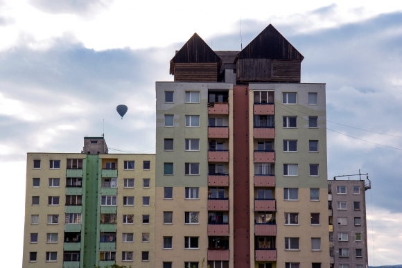 Stavba Pamätníka ľudovej architektúry, ľudovo nazývaného "tri drevenice na paneláku". Pamätník je umeleckým projektom mladého výtvarníka Tomáša Džadoňa, ktorý ho realizoval na obytnom panelovom dome na Lidickom námestí číslo 1, na košickom sídlisku Dargovských hrdinov Foto: SITA/Archív Tomáša Džadoňa
