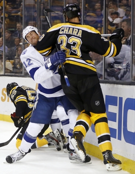 Do rozbiehajúcej sa sezóny NHL zasiahol už aj Zdeno Chára s Bostonom. Jeho tím strelil Tampe dva góly v oslabení a celkovo vyhral 3:1. Cháru vyhlásili za druhú hviezdu zápasu. Foto: SITA/AP