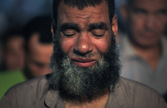 Fanúšik zosadeného egyptského prezidenta Mohammeda Morsiho plače pri modlitbe neďaleko mešity Rabaah al-Adawiya, kde si prezidentovi podporovatelia zriadili stanové mestečko. Foto: SITA/AP