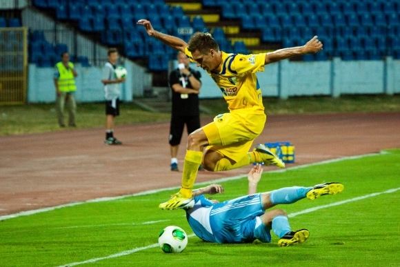 Ani letecké kúsky nepomohli futbalistom Myjavy v zápase na Slovane. Domáci sa po sérii nepresvedčivých výsledkov na hosťoch a vyhrali 5:0. Foto: SITA/Diana Černáková
