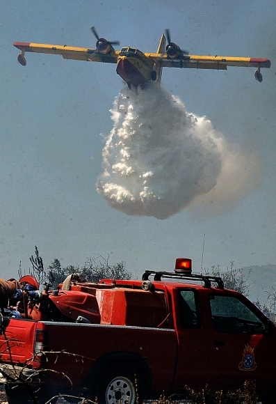 Hasičské lietadlo vypúšťa vodnú smršť na horiaci porast 60 km od hlavného gréckeho mesta Atény. Práce na hasení komplikuje 150 hasičom najmä silný vietor. Foto: SITA/AP