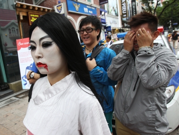 Zamestnankyňa juhokórejského zábavného parku Everland láka na halloweenske akcie. Foto: SITA/AP