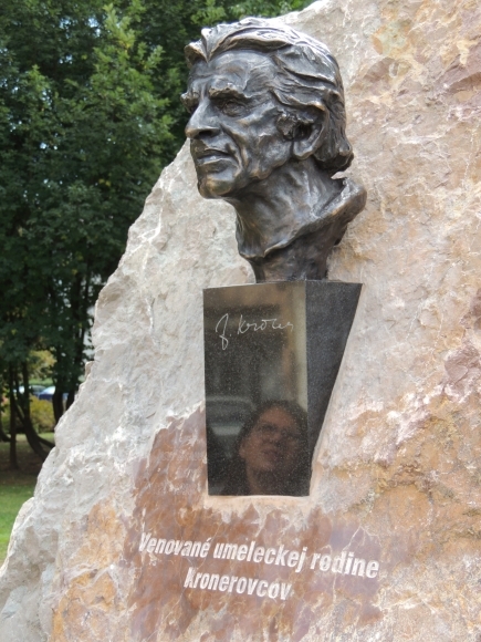 Prvý pamätník venovaný umeleckej rodine Kronerovcov v považskobystrickom parčíku na Lánoch. Na približne 15-kilovú bronzovú sochu herca Jozefa Kronera osadenú v prírodnom kameni sa vo verejnej zbierke poskladali sami Považskobystričania. Autorkou pamätníka je sochárka Elena Pätoprstá. Foto: SITA/Matúš Ružička