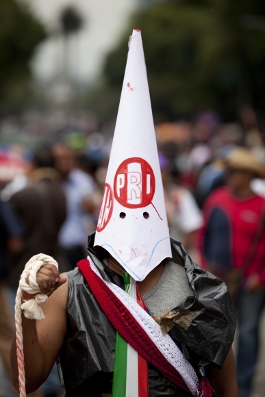 Obyvatelia Mexika protestujú proti vzdelávacej reforme. Vláda chce okrem iných oblastí zreformovať aj systém škôl. Maska, ktorú má demonštrant na sebe, sa nazýva "capirote," a v španielsku ju mali n ahlavách osoby, odsúdené inkvizíciou. Foto: SITA/AP