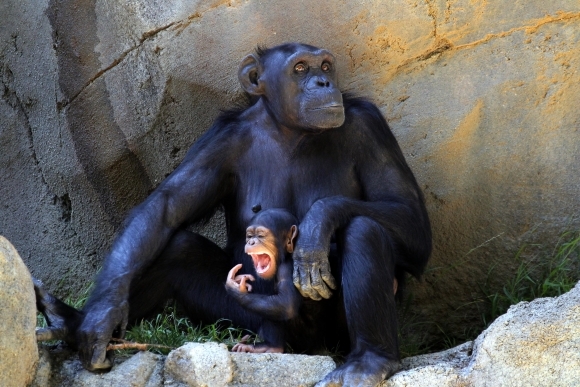 ZOO v Los Angeles sa pochválila novým šimpanzým prírastkom. Mláďa sa však príliš ukazovať nechce, vzhľadom na horúce počasie sa drží v tieni na okraji svojho pavilónu. Foto: SITA/AP