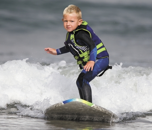 Len trojročný Triston Gailey dokáže na surfe ustáť mierne vlny v kalifornskom zálive Morro. Foto: SITA/AP