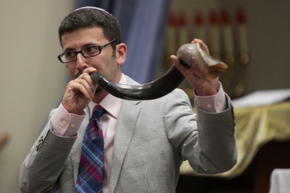 Rabín Joshua Hearshen fúka do šofaru, vyrobeného z baranieho rohu v predvečer židovského Nového roka. Foto: SITA/AP