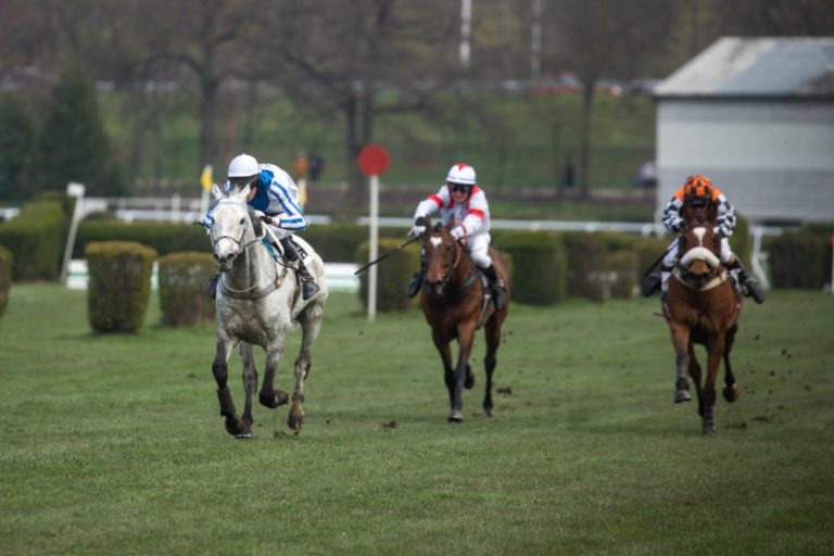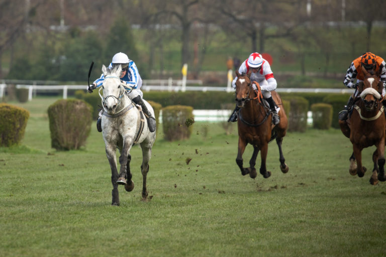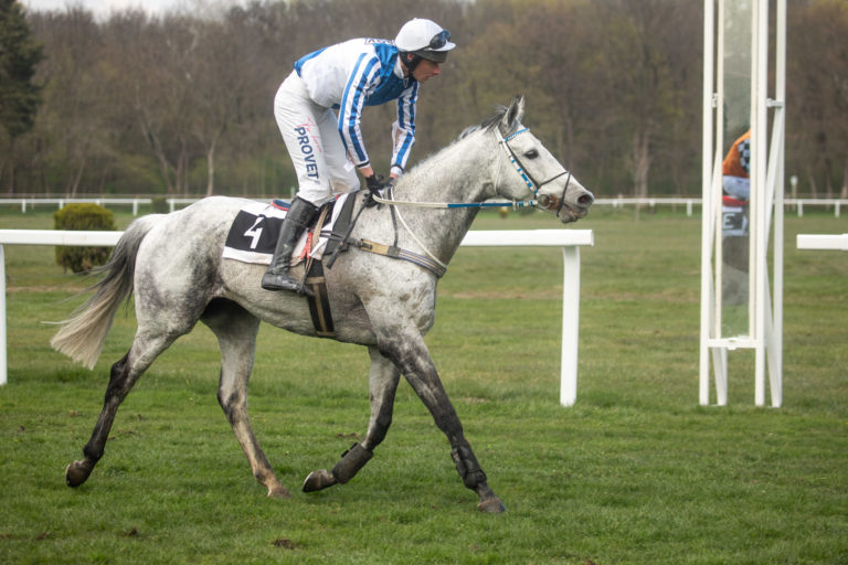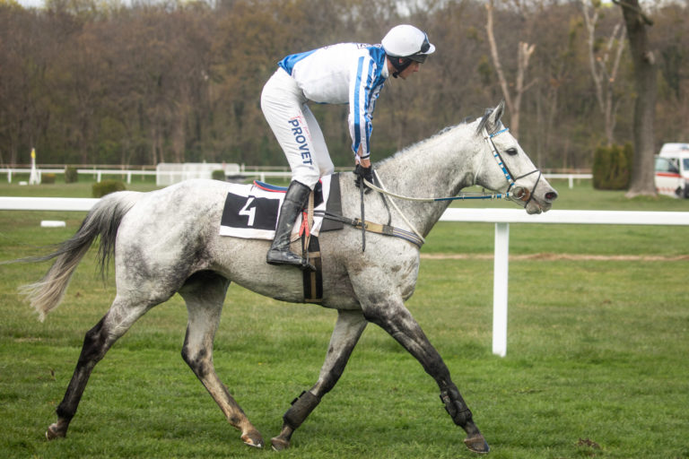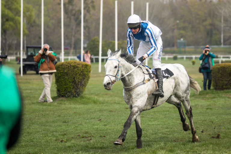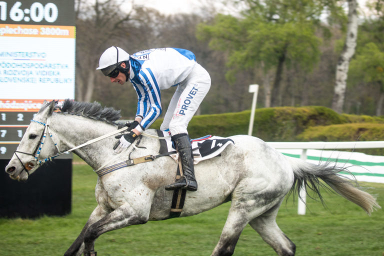 Víťazný kôň Royal Gino a džokej Jan Odložil počas dostihových pretekov 50. ročníka Jarnej ceny Petržalky na Závodisku v Bratislave. Bratislava, 9. apríl 2023. Foto: SITA/Diana Černáková