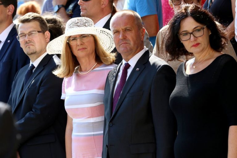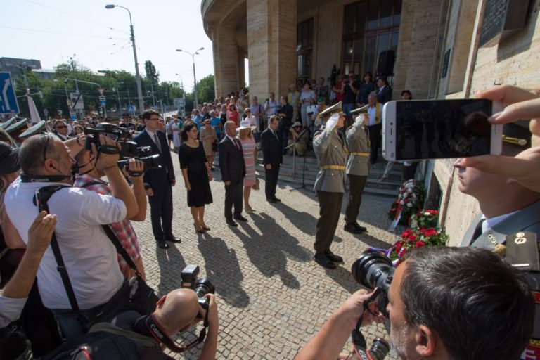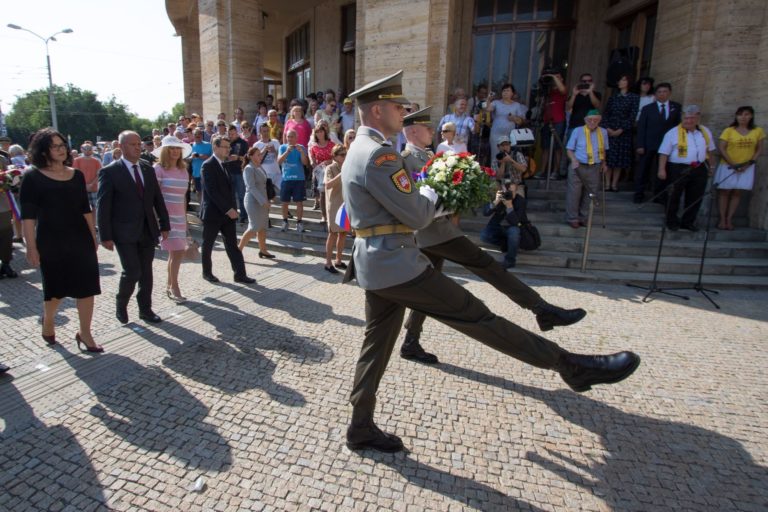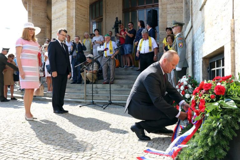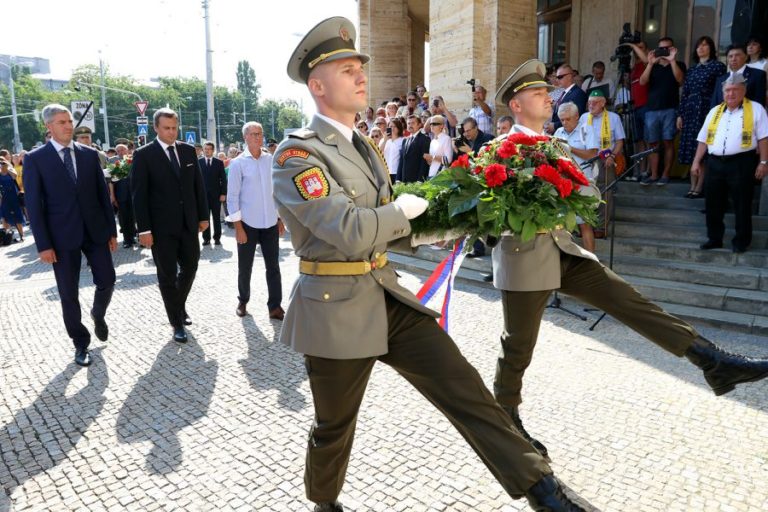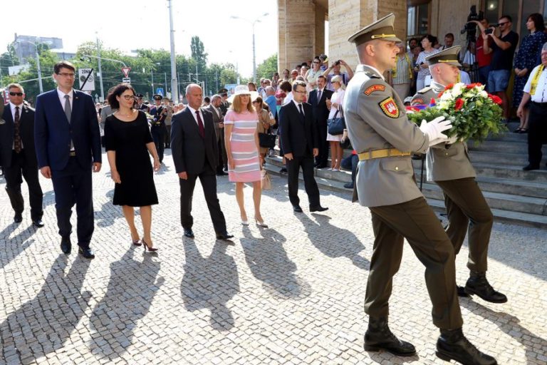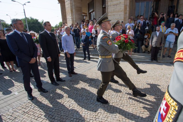 Minister obrany Peter Gajdoš (vpravo v popredí) a podpredsedníčka vlády a ministerka pôdohospodárstva a rozvoja vidieka Gabriela Matečná (vľavo) počas pietneho aktu kladenia vencov k pamätnej tabuli Danky Košanovej, Stanislava Siváka a kpt. Jána Holíka, pred budovou UK v Bratislave pri príležitosti 50. výročia vpádu vojsk Varšavskej zmluvy do Československa v roku 1968. Bratislava, 21. august 2018. Foto: SITA/MO SR