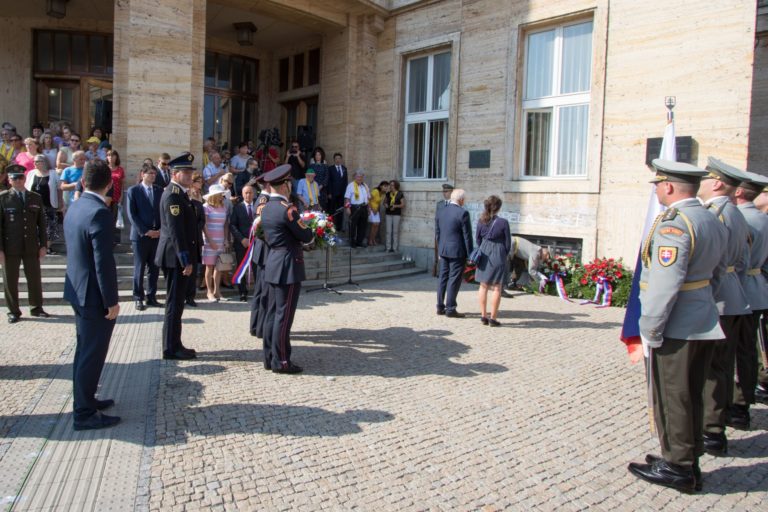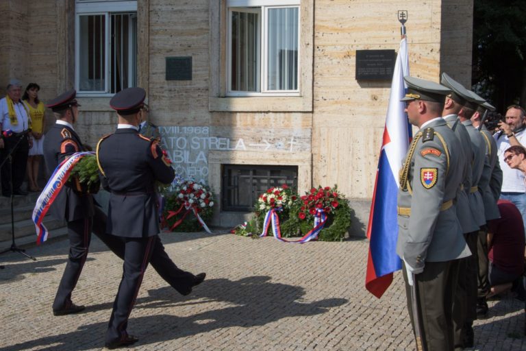 Atmosféra pietneho aktu kladenia vencov k pamätnej tabuli Danky Košanovej, Stanislava Siváka a kpt. Jána Holíka, pred budovou UK v Bratislave pri príležitosti 50. výročia vpádu vojsk Varšavskej zmluvy do Československa v roku 1968 za účasti ústavnych činisteľov. Bratislava, 21. august 2018. Foto: SITA/Ľudovít Vaniher