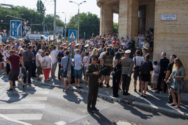Čestná stráž počas pietneho aktu kladenia vencov k pamätnej tabuli Danky Košanovej, Stanislava Siváka a kpt. Jána Holíka, pred budovou UK v Bratislave pri príležitosti 50. výročia vpádu vojsk Varšavskej zmluvy do Československa v roku 1968. Bratislava, 21. august 2018. Foto: SITA/Ľudovít Vaniher