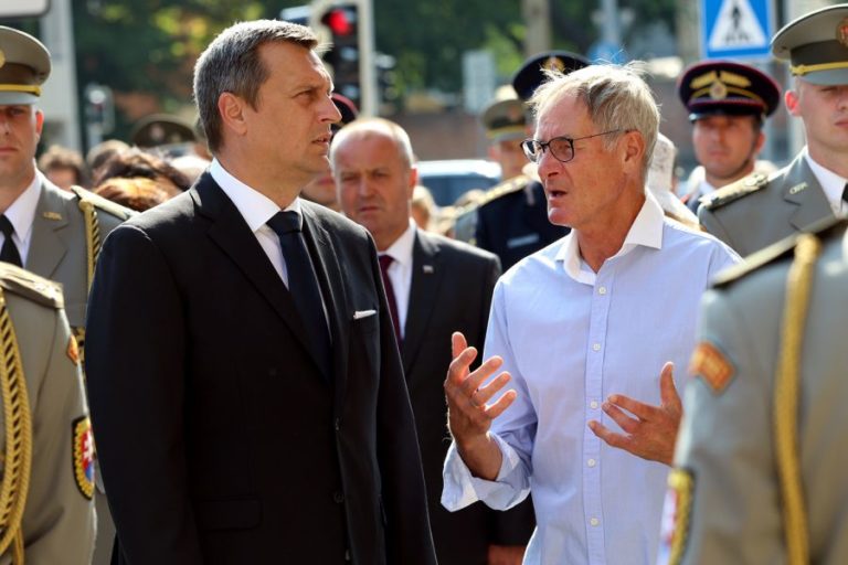 Zľava: Predseda NR SR Andrej Danko a bývalý predseda KDH Pavol Hrušovský počas pietneho aktu kladenia vencov k pamätnej tabuli Danky Košanovej, Stanislava Siváka a kpt. Jána Holíka, pred budovou UK v Bratislave pri príležitosti 50. výročia vpádu vojsk Varšavskej zmluvy do Československa v roku 1968. Bratislava, 21. august 2018. Foto: SITA/MO SR