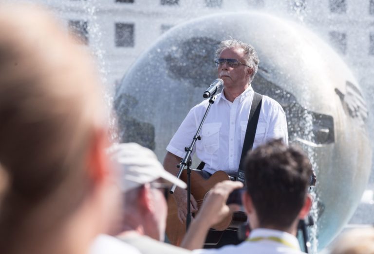 Hudobník Pavol Hammel počas výstavy fotografií Josefa Koudelky a Ladislava Bielika s názvom: Invázia August 68 na Hodžovom námestí v Bratislave pri príležitosti 50. výročia vpádu vojsk Varšavskej zmluvy do Československa v roku 1968. Bratislava, 21. august 2018. Foto: SITA/Braňo Bibel