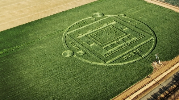 Výrobca grafických procesorov Nvidia vytvoril na obrovskom poli v Kalifornii napodobeninu bájnych mimozemských kruhov v obilí. Kruhy sú v rámci reklamnej kampane firmy v tvare grafického čipu. Foto: SITA/AP