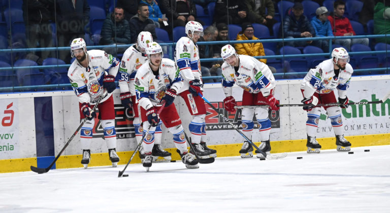 Rozcvička Spišiakov pred šiestým zápasom semifinále play-off Tipos extraligy 2022/2023 HK Grotto Spišská Nová Ves - HKM Zvolen. Spišská Nová Ves, 11. apríl 2023. Foto: SITA/Viktor Zamborský