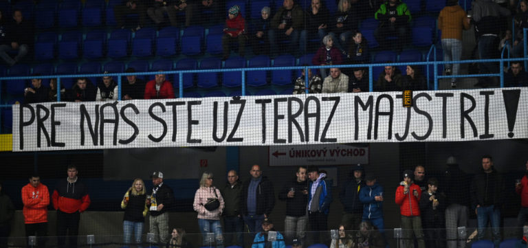 Transparent fanúšikov Spišskej Novej Vsi pred šiestým zápasom semifinále play-off Tipos extraligy 2022/2023 HK Grotto Spišská Nová Ves - HKM Zvolen. Spišská Nová Ves, 11. apríl 2023. Foto: SITA/Viktor Zamborský
