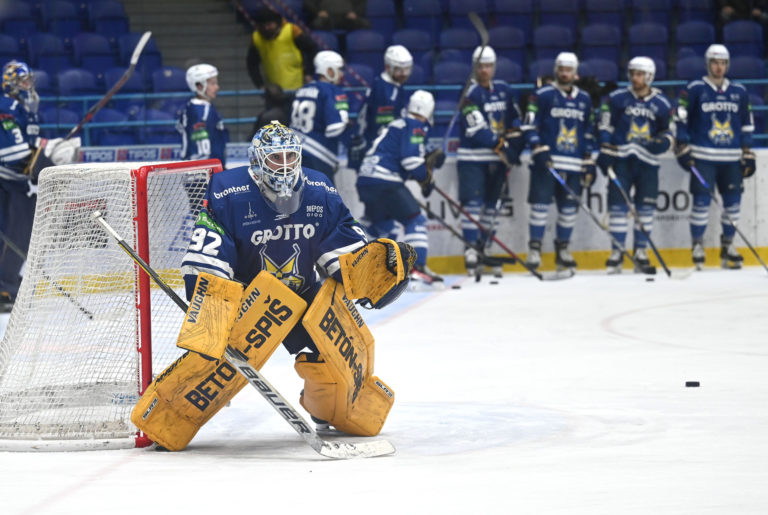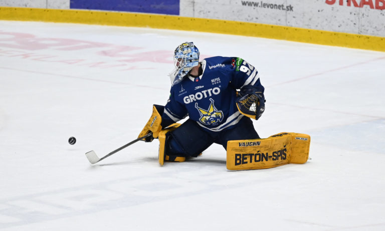 Brankár HK Grotto Marcel Melicherčík počas šiesteho zápasu semifinále play-off Tipos extraligy 2022/2023 HK Grotto Spišská Nová Ves - HKM Zvolen. Spišská Nová Ves, 11. apríl 2023. Foto: SITA/Viktor Zamborský