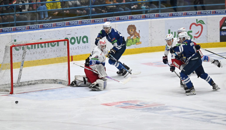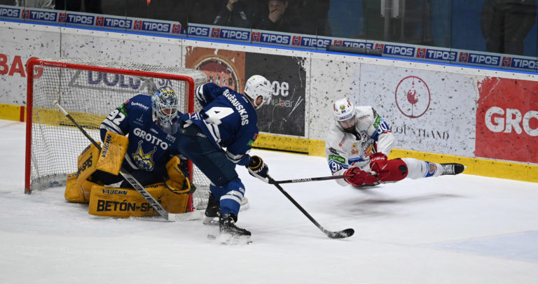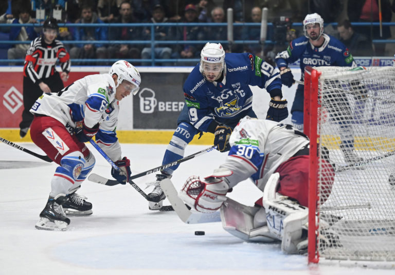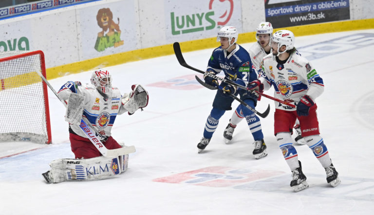 Zľava: Brankár Marcel Melicherčík, Nerijus Ališauskas obaja z HK Grotto a Marek Videnský zo Zvolena počas šiesteho zápasu semifinále play-off Tipos extraligy 2022/2023 HK Grotto Spišská Nová Ves - HKM Zvolen. Spišská Nová Ves, 11. apríl 2023. Foto: SITA/Viktor Zamborský