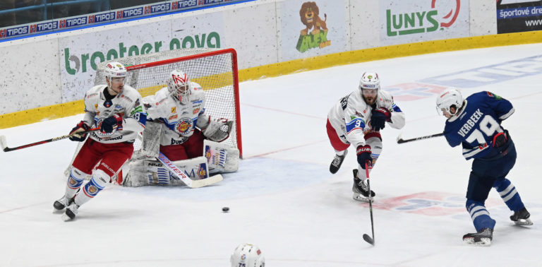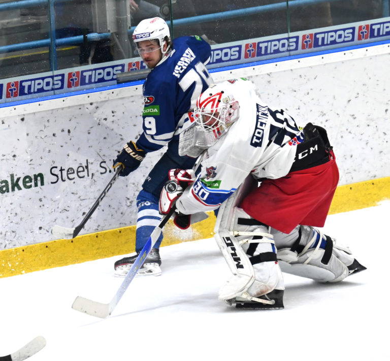 Zľava: Hayden Verbeek Spišská Nová Ves a brankár Zvolena Adam Trenčan počas šiesteho zápasu semifinále play-off Tipos extraligy 2022/2023 HK Grotto Spišská Nová Ves - HKM Zvolen. Spišská Nová Ves, 11. apríl 2023. Foto: SITA/Viktor Zamborský