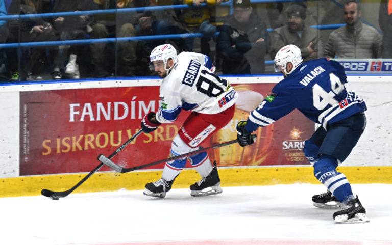 Zľava Karol Csányi zo Zvolena a Juraj Valach počas šiesteho zápasu semifinále play-off Tipos extraligy 2022/2023 HK Grotto Spišská Nová Ves - HKM Zvolen. Spišská Nová Ves, 11. apríl 2023. Foto: SITA/Viktor Zamborský