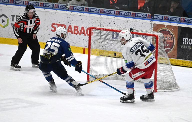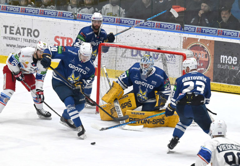 Hráč HK Grotto Šimon Groch (uprostred) počas šiesteho zápasu semifinále play-off Tipos extraligy 2022/2023 HK Grotto Spišská Nová Ves - HKM Zvolen. Spišská Nová Ves, 11. apríl 2023. Foto: SITA/Viktor Zamborský