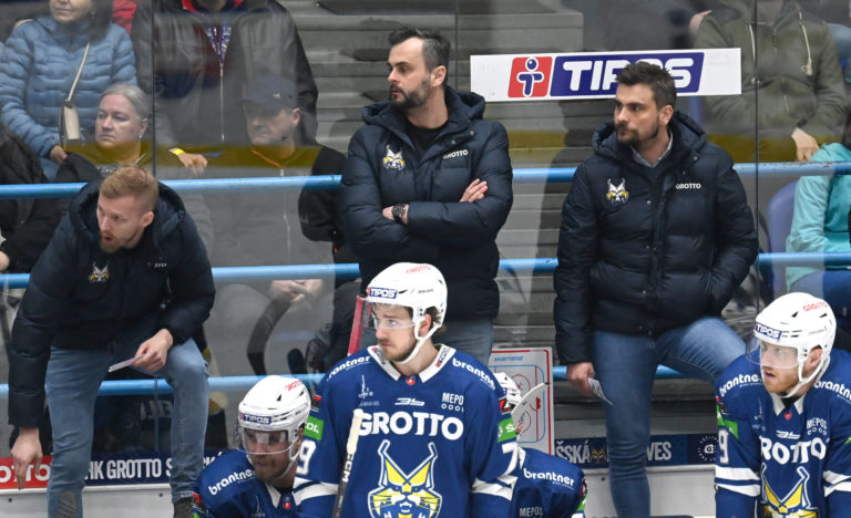 Tréner Spišskej Novej Vsi Vlastimil Wojnar (uprostred hore) počas šiesteho zápasu semifinále play-off Tipos extraligy 2022/2023 HK Grotto Spišská Nová Ves - HKM Zvolen. Spišská Nová Ves, 11. apríl 2023. Foto: SITA/Viktor Zamborský
