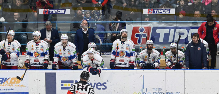 Striedačka HK Grotto počas šiesteho zápasu semifinále play-off Tipos extraligy 2022/2023 HK Grotto Spišská Nová Ves - HKM Zvolen. Spišská Nová Ves, 11. apríl 2023. Foto: SITA/Viktor Zamborský