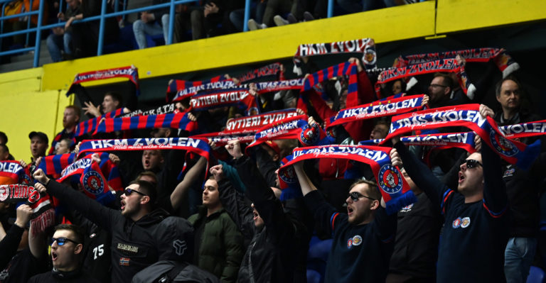 Fanúšikovia HKM Zvolen počas šiesteho zápasu semifinále play-off Tipos extraligy 2022/2023 HK Grotto Spišská Nová Ves - HKM Zvolen. Spišská Nová Ves, 11. apríl 2023. Foto: SITA/Viktor Zamborský