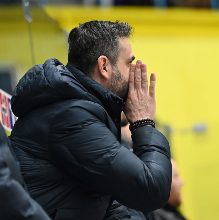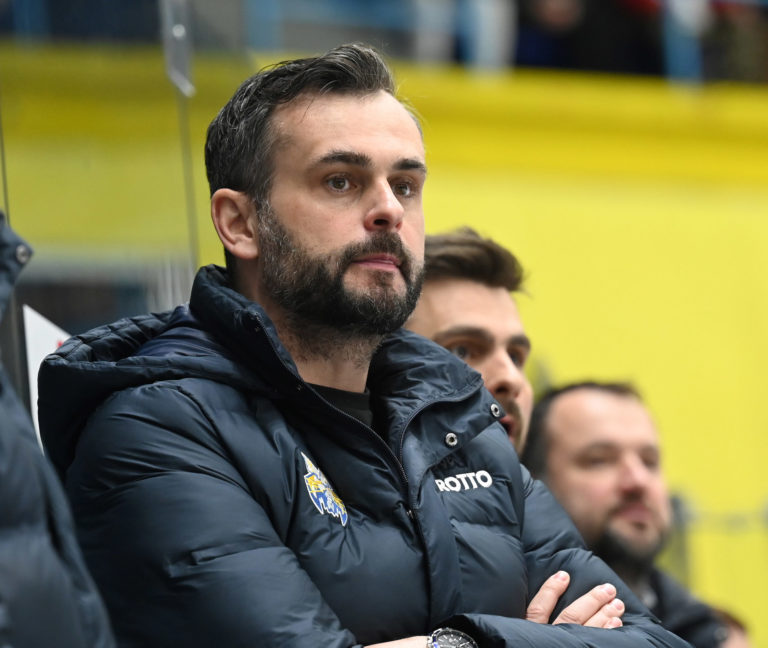 Tréner Spišskej Novej Vsi Vlastimil Wojnar počas šiesteho zápasu semifinále play-off Tipos extraligy 2022/2023 HK Grotto Spišská Nová Ves - HKM Zvolen. Spišská Nová Ves, 11. apríl 2023. Foto: SITA/Viktor Zamborský