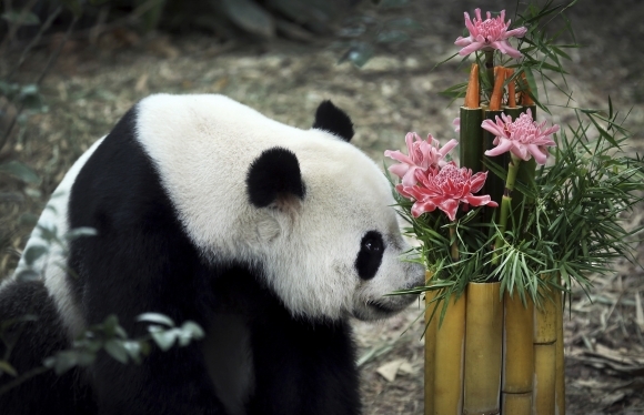 Singapurská ZOO oslavuje prvý rok príchodu páru pánd. Samec Kai Kai a slečna Jia Jia pri tej príležitosti dostali koláč z bambusov, kvetov a ovocia. Foto: SITA/AP