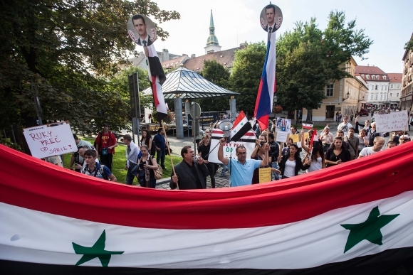Účastníci protestného zhromaždenia Zväzu sýrskych študentov na Slovensku - Nechceme vojnu v Sýrii spojeného s pochodom k Francúzskej a Americkej ambasáde v Bratislave. Foto: SITA/Jozef Jakubčo