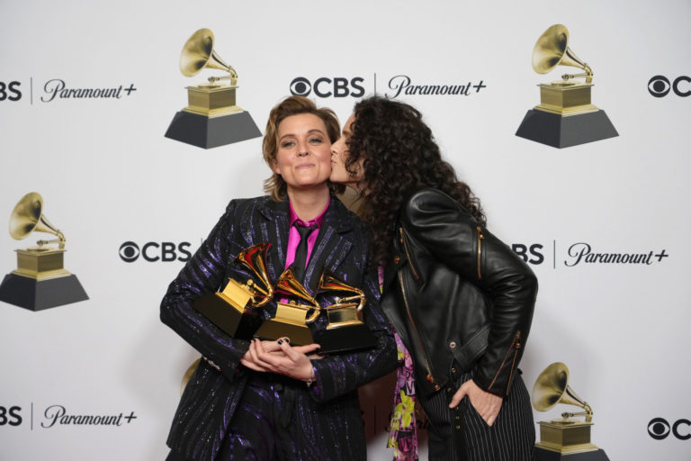Brandi Carlile, víťazka cien za najlepšiu rockovú pieseň za skladbu „Broken Horses“, najlepší americký album za album „In These Silent Days“ a najlepší rockový výkon za skladbu „Broken Horses“, odišla a Catherine Shepherd pózovala v tlačovej miestnosti na 65. ročníku Udeľovanie cien Grammy v nedeľu 5. februára 2023 v Los Angeles. Foto: SITA/AP.