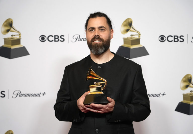 Blake Slatkin, víťaz ceny za nahrávku roka za pieseň „About Damn Time“ od Lizzo, pózuje v tlačovej miestnosti na 65. ročníku odovzdávania cien Grammy v nedeľu 5. februára 2023 v Los Angeles. Foto: SITA/AP.