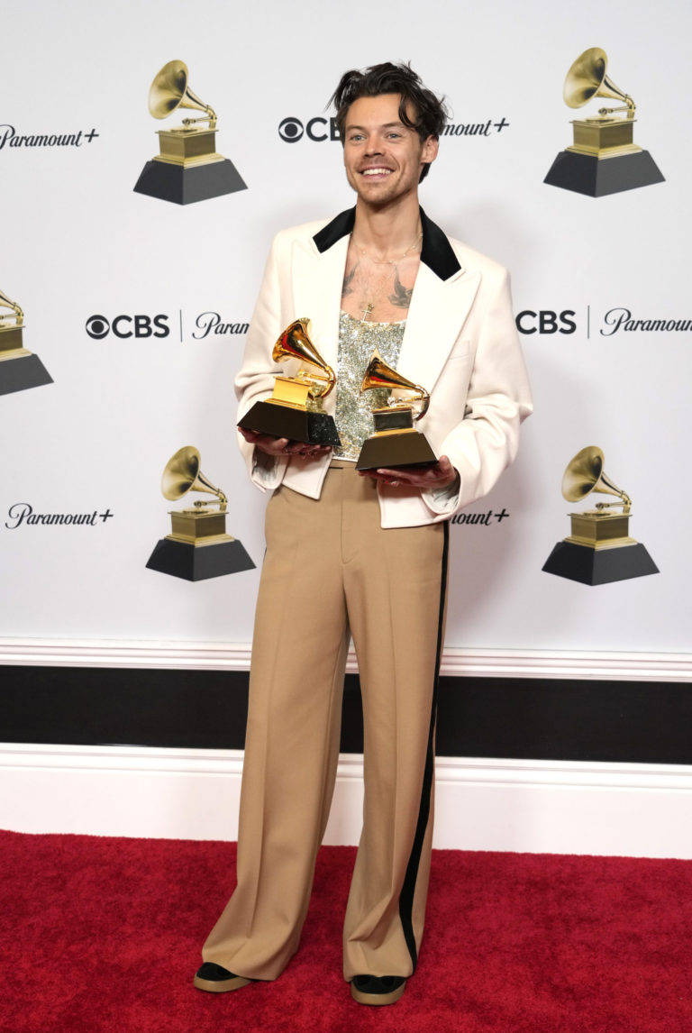 Harry Styles, víťaz ceny za album roka za „Harry's House“ a najlepší popový vokálny album za „Harry's House“, pózuje v tlačovej miestnosti na 65. ročníku odovzdávania cien Grammy v nedeľu 5. februára 2023 v Los. Angeles. Foto: SITA/AP.