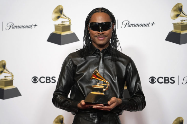 Steve Lacy, víťaz ceny za najlepší progresívny R&B album za „Gemini Rights“, pózuje v tlačovej miestnosti na 65. ročníku odovzdávania cien Grammy v nedeľu 5. februára 2023 v Los Angeles. Foto: SITA/AP.