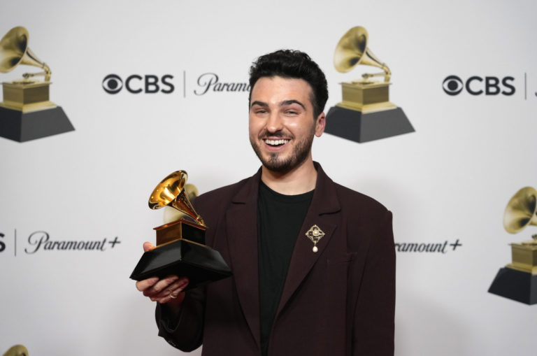 Tyler Johnson, víťaz najlepšieho albumu roka za "Harry's House", pózuje v tlačovej miestnosti na 65. ročníku odovzdávania cien Grammy v nedeľu 5. februára 2023 v Los Angeles. Foto: SITA/AP.