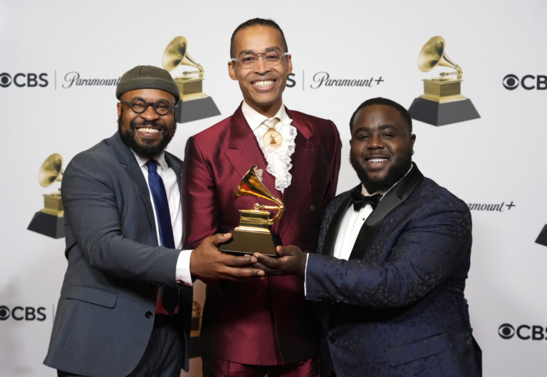Larry Jenkins Jr., zľava, Sir the Baptist a Dubba-AA, víťazi ceny za najlepší koreňový gospelový album za „The Urban Hymnal“ od pochodovej kapely Tennessee State University (TSU), pózujú v tlačovej miestnosti na 65. ročníku Grammy Ocenenia v nedeľu 5. februára 2023 v Los Angeles. Foto: SITA/AP.