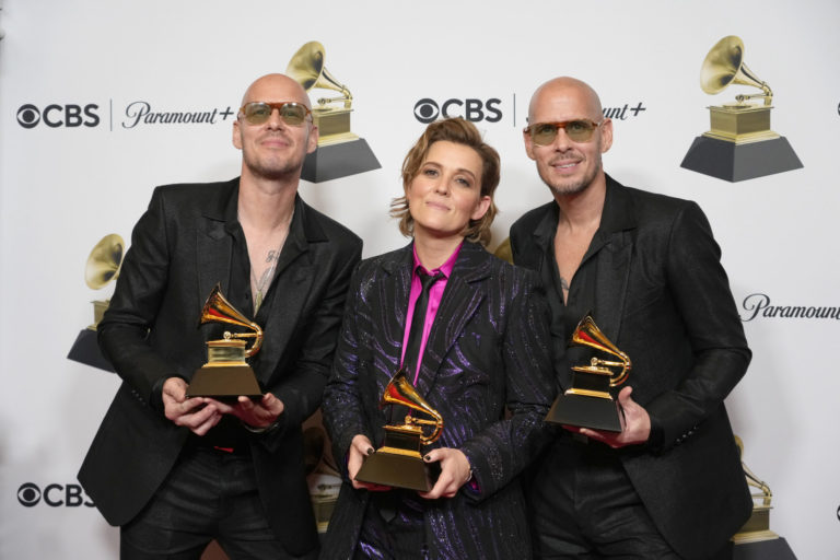 Tim Hanseroth, zľava, Brandi Carlile a Phil Hanseroth, víťazi ocenení za najlepšiu rockovú pieseň za skladbu „Broken Horses“, najlepší americký album za album „In These Silent Days“ a najlepší rockový výkon za skladbu „Broken Horses“, pózujú vo filme tlačová miestnosť na 65. ročníku odovzdávania cien Grammy v nedeľu 5. februára 2023 v Los Angeles. Foto: SITA/AP.