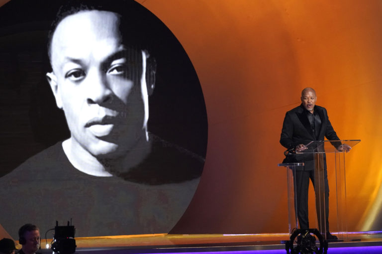 Dr. Dre prijíma ocenenie Dr. Dre za globálny vplyv na 65. ročníku odovzdávania cien Grammy v nedeľu 5. februára 2023 v Los Angeles. Foto: SITA/AP.
