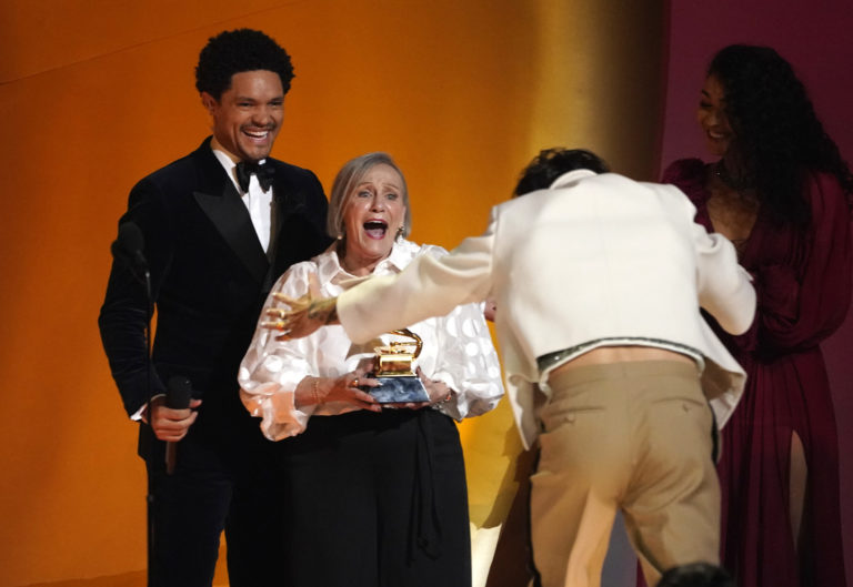 Fanúšička Harryho Stylesa, Reina Fafantaisie, v strede, odovzdáva Harrymu Stylesovi (vpravo) cenu za album roka za „Harry's House“ na 65. výročnom odovzdávaní cien Grammy v nedeľu 5. februára 2023 v Los Angeles. Moderátor Trevor Noah sa pozerá zľava. Foto: SITA/AP.