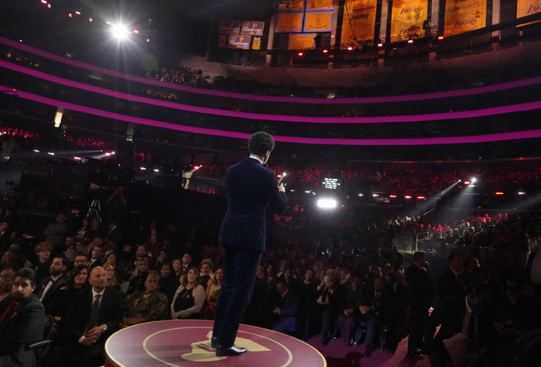 Moderátor Trevor Noah hovorí na pódiu počas 65. ročníka odovzdávania cien Grammy v nedeľu 5. februára 2023 v Los Angeles. Foto: SITA/AP.
