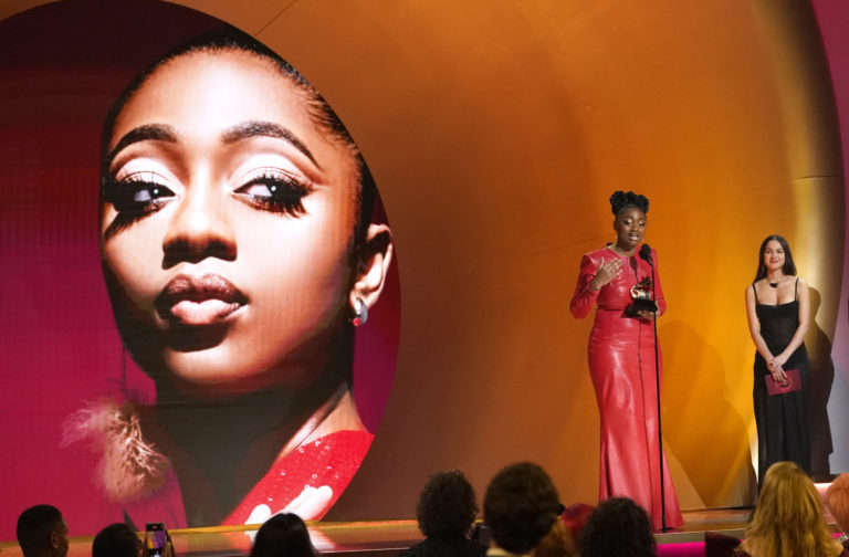 Samara Joy preberá cenu pre najlepšiu novú umelkyňu na 65. ročníku odovzdávania cien Grammy v nedeľu 5. februára 2023 v Los Angeles. Olivia Rodrigo sa pozerá sprava. Foto: SITA/AP.